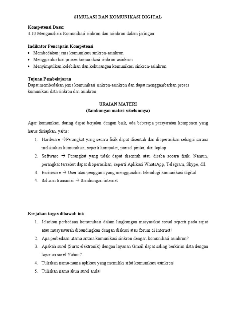 Komunikasi dalam jaringan adalah komunikasi yang dilakukan secara online menggunakan jaringan internet. Menurut yohanssen pratama dalam buku sistem terdistribusi (2021), komunikasi sinkron adalah pertukaran interaktif 'hidup' antara sejumlah orang. Artinya jenis komunikasi daring ini terjadi secara real time atau nyata di antara berbagai pihak. Komunikasi video asinkron ini memakai rekaman video buat berkomunikasi kepada seorang, dengan maksud agar orang yang menerima video yang di maksud bisa mengerti apa yang ingin diberitahu oleh si pengirim video. Komunikasi daring asinkron (tak langsung) merupakan komunikasi memakai perangkat komputer dan dilakukan secara tunda. Sinkron asinkron bentuk komunikasi daring 7 persamaan perbedaan beritaku berdasarkan metode penyampaiannya, komunikasi daring dapat dibedakan menjadi dua jenis yaitu komunikasi sinkron dan komunikasi asinkron. Komunikasi seperti itu antara klien dan server dikenal sebagai komunikasi sinkron. Komunikasi daring adalah singkatan dari komunikasi dalam jaringan. Text chat dan video chat. Demikianlah informasi mengenai perbedaan utama komunikasi sinkron dengan komunikasi asinkron. Terdapat dua jenis komunikasi daring : Semoga informasi ini dapat bermanfaat bagi kita semua. 19/04/2018 · perbedaan komunikasi daring sinkron dan asinkron.