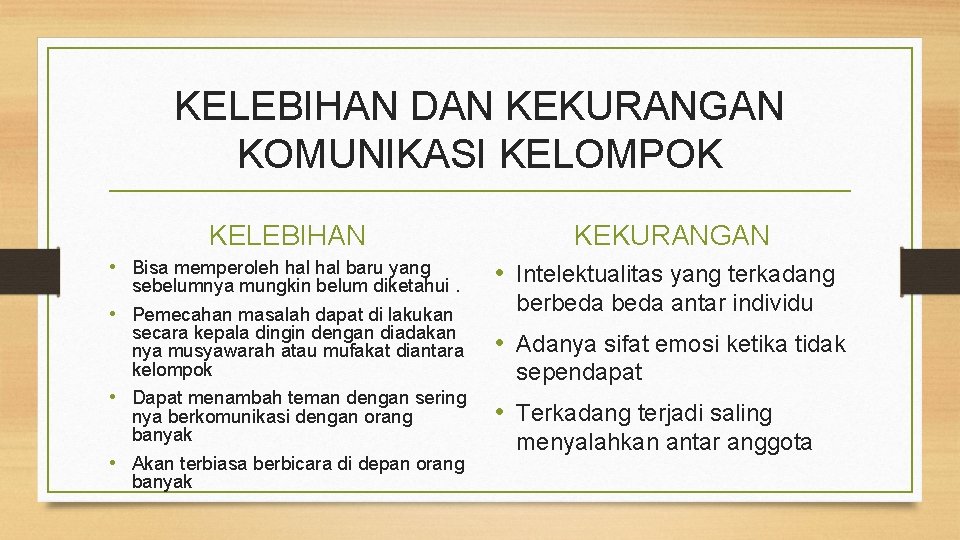 Kedua definisi komunikasi kelompok di atas mempunyai kesamaan, yakni adanya komunikasi tatap muka, peserta komunikasi lebih dari dua orang, dan .