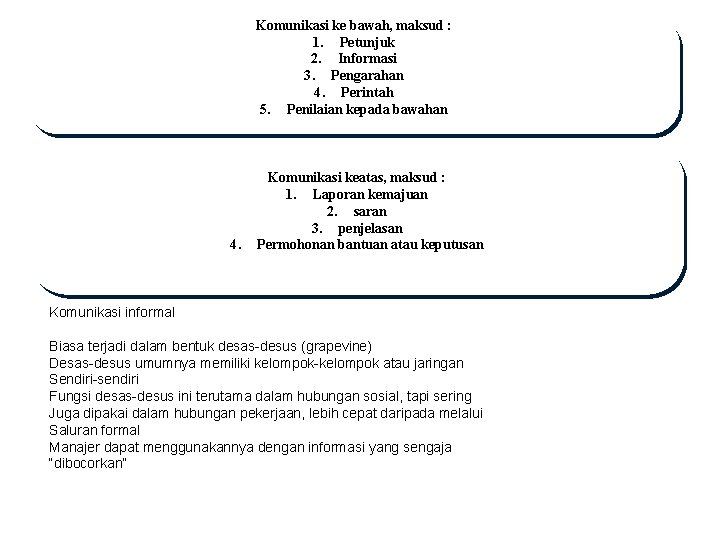 Subyek penelitian komunikasi kebawah ini adalah pt. Komunikasi ke atas merupakan proses komunikasi yang terjadi antara bawahan dengan atasan. Komunikasi ke bawah (downward communication) adalah penyampaian informasi dari atasan ke bawahan sesuai dengan struktural di organisasi. Komunikasi ke bawah (downward communication) yaitu. Komunikasi ke bawah (downward communication) adalah penyampaian informasi dari atasan ke bawahan sesuai dengan struktural di organisasi. Informasi atau pesan yang disampaikan dalam arah komunikasi ini . Komunikasi vertikal yaitu komunikasi yang di lakukan dari atas kebawah (downward communication) dan komunikasi dari bawah ke atas (upward communication) yaitu. Komunikasi ke bawah (downward communication) adalah penyampaian informasi dari atasan ke bawahan sesuai dengan struktural di organisasi. Komunikasi yang dilakukan dari tingkat yang lebih tinggi (atas) ke tingkat yang lebih rendah (bawah). Komunikasi ke bawah adalah rantai komando formal yang dibentuk untuk mengarahkan bawahan dan menyampaikan informasi, yang berkaitan dengan tujuan, kebijakan, . Menurut lewis, komunikasi ke bawah juga dimaksudkan untuk merubah sikap, membentuk pendapat, mengurangi ketakutan, kecurigaan yang timbul karena salah informasi .