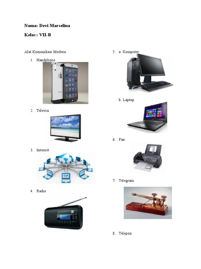1.telepon telepon adalah sebuah perangkat komunikasi yang digunakan oleh dua individu atau lebih dengan media suara. Dengan menggunakan faksmili maka pesan dengan bentuk kertas akan bisa sampai ke tujuan yang diinginkan. Di awal perkembangan teknologi, telepon kabel. Alat komunikasi ini menggunakan listrik sebagai penghubung ke orang lain dengan jarak yang cukup jauh, manusia dapat berkomunikasi dengan baik. Namun kini seiring dengan perkembangan teknologi yang alat komunikasi zaman sekarang semakin canggih membuat telepon menjadi lebih modern dari sebelumnya.