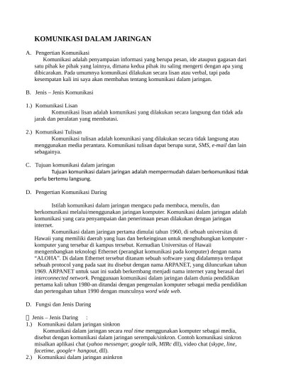 Manfaat komunikasi daring · sebagai sebuah sarana untuk percakapan · sebagai sebuah sarana untuk perdagangan online · sebagai sebuah sarana untuk . Komunikasi daring adalah cara berkomunikasi dimana proses penyampaian pesan dilakukan melalui jaringan internet. Komunikasi dalam jaringan internet mendorong yang yang terbiasa diam di dunia nyata menjadi aktif berkomunikasi di dunia . · mempermudah proses pembelajaran via online. Adapun fungsi komunikasi daring atau komunikasi dalam jaringan yaitu: