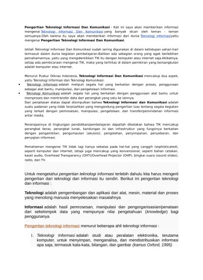 Dalam pengertian yang lebih luas, teknologi dapat meliputi: 13 hadi sutopo, teknologi informasi dan komunikasi dalam pendidikan. Secara terminologi, pengertian tik adalah suatu proses . Tik adalah singkatan dari teknologi informasi dan komunikasi. Pengertian teknologi informasi menurut wilkinson (2005;