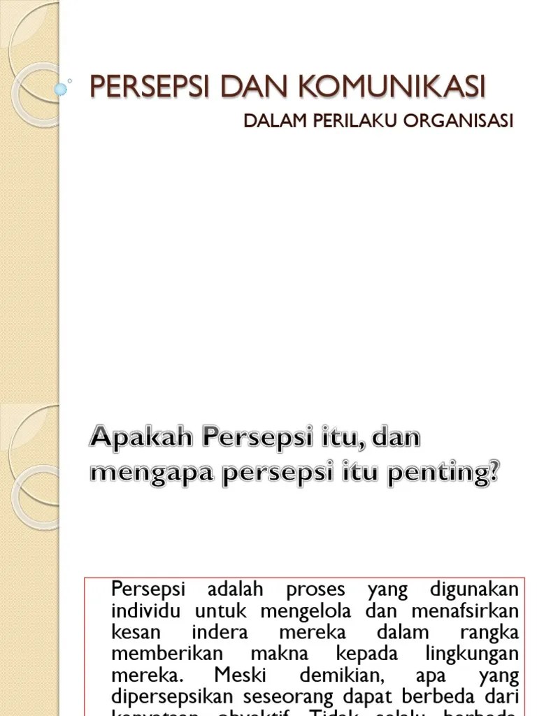 22/03/2022 · persepsi adalah menyampaikan makna pada stimuli inderawi, atau menafsirkan gosip yg tertangkap sang indera indera. Akan tetapi manusia mempersepsi kita pada saat kita mempersepsi mereka. Oleh karena itu tidaklah berlebihan apabila kita katakan, bahwa Persepsi sbg inti komunikasi persepsi memiliki peran yang sangat penting dalam keberhasilan komunikasi. Dalam komunikasi, persepsi bisa diartikan sebagai tahapan tiap individu atau kelompok dalam mengenali serta memahami lingkungannya lewat bantuan pancaindra.